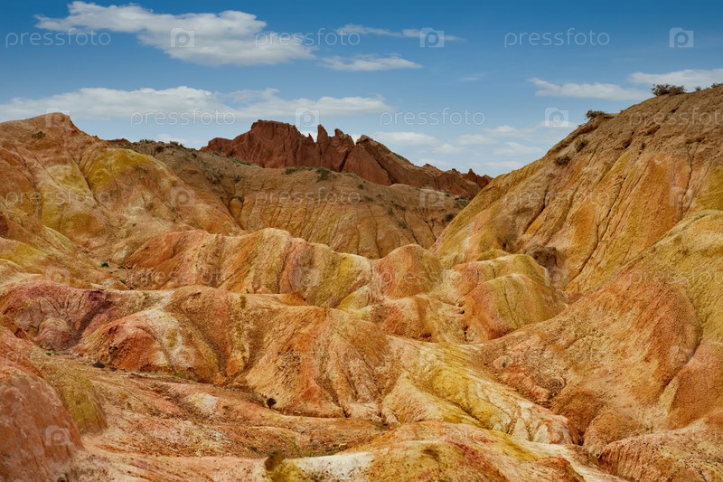 Кыргызстан, восточный берег озера Иссык-Куль. Вид на степную долину реки Арашан с редкими одинокими елями среди заросших гор