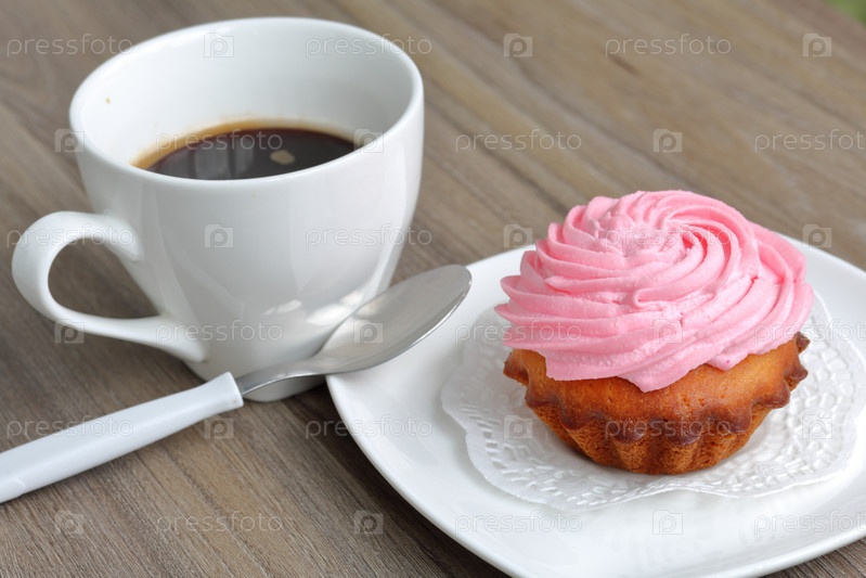Кремовый торт и чашка кофе. Торт лежит на блюдце. Рядом кофейная ложка