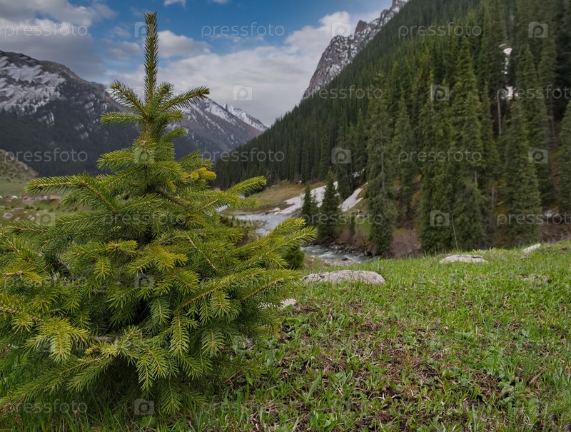 Кыргызстан, восточный берег озера Иссык-Куль. Вид на степную долину реки Арашан с редкими одинокими елями среди заросших гор