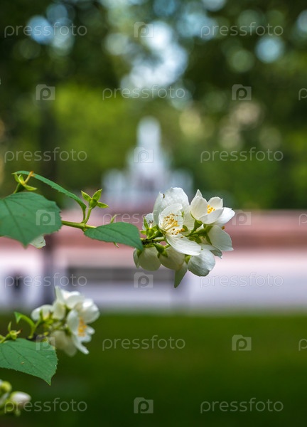Цветы жасмина на фоне фонтана