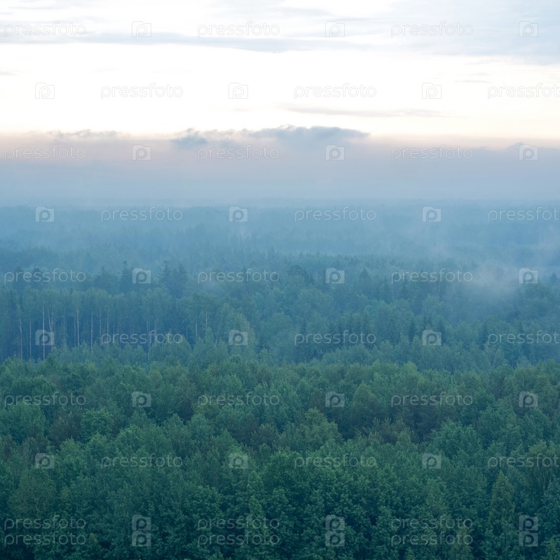 Вид с воздуха на туманный лес утром на рассвете