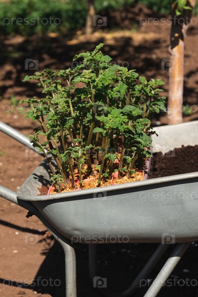 Саженцы картофеля с зелеными ростками в тачке с землей готовятся к посадке в землю крупным планом