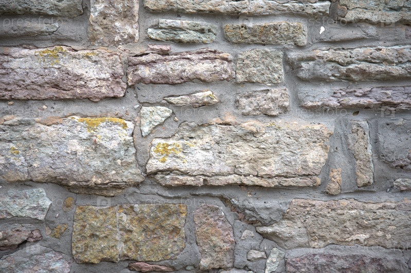 Каменная старинная кладка со мхом. Фрагмент стены. Серый оттенок