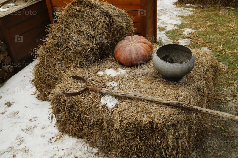 Зима, деревенский быт, снег, кочерга, котелок, тыква