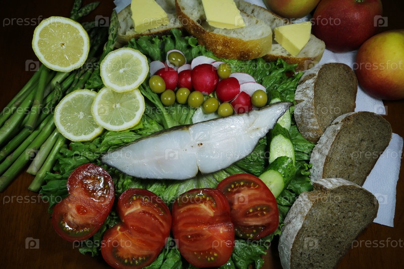 Рыба палтус с овощами, зеленью, спаржей. Натюрморт с рыбой