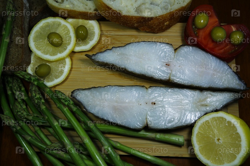 Свиной окорок, ребрышки копченые, овощи, лист салата,спаржа на блюде