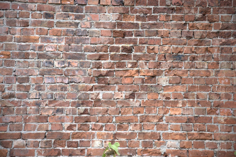 Старая кирпичная кладка с растением в низу. Часть стены. Оранжевый цвет