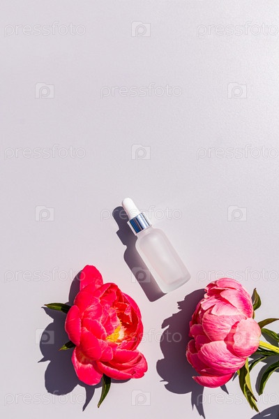Матовый косметический флакон с натуральным средством по уходу за лицом и телом на сером фоне с цветком. натуральная косметика. Вертикальный вид сверху. Место для копирования