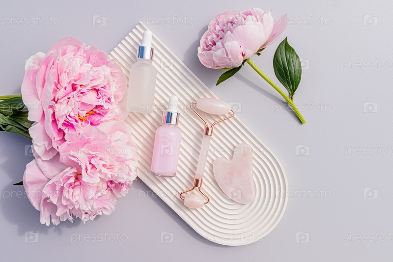 Два косметических флакона с натуральным продуктом для кожи лица. Роликовый массажер из розового кварца и гуаша на белом керамическом подносе с цветком