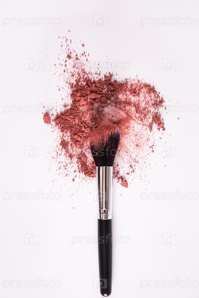 Верхний вертикальный вид на кучу рассыпчатых румян, пудры розового тона с шикарной изящной кистью для макияжа. Макет образца для презентации продукта