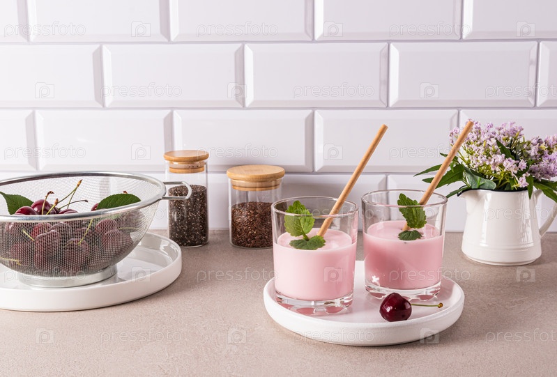 Нежный легкий десерт из вишневого смузи в двух стеклянных стаканах на белом подносе рядом с ситом с мытой вишней. Стена из белого кирпича