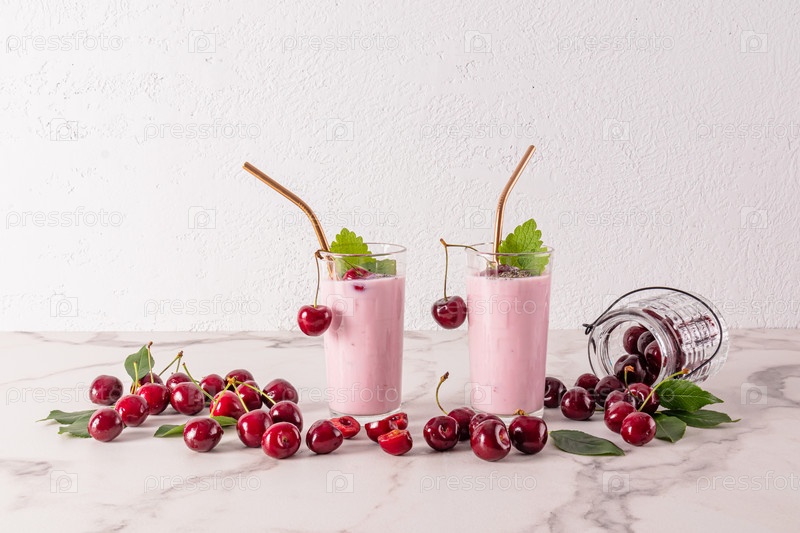 Два шикарных бокала с нежным охлажденным смузи или коктейлем с металлической трубочкой на мраморном столе среди многочисленных спелых вишен. Передний план