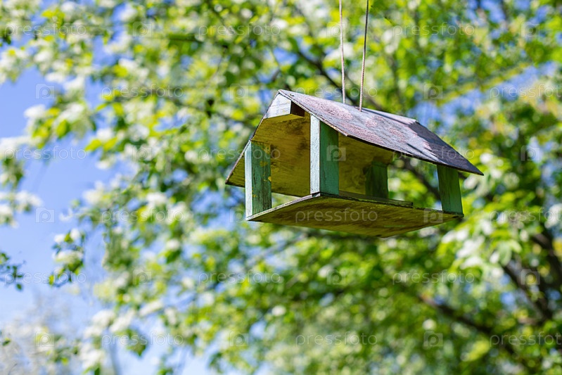 Кормушка для птиц висит на яблоне. Скворечник на дереве. Ветка яблони с скворечником. Гнездовой ящик в общественном парке для корма для птиц. Нежные цветы и лепестки цветущего дерева весной