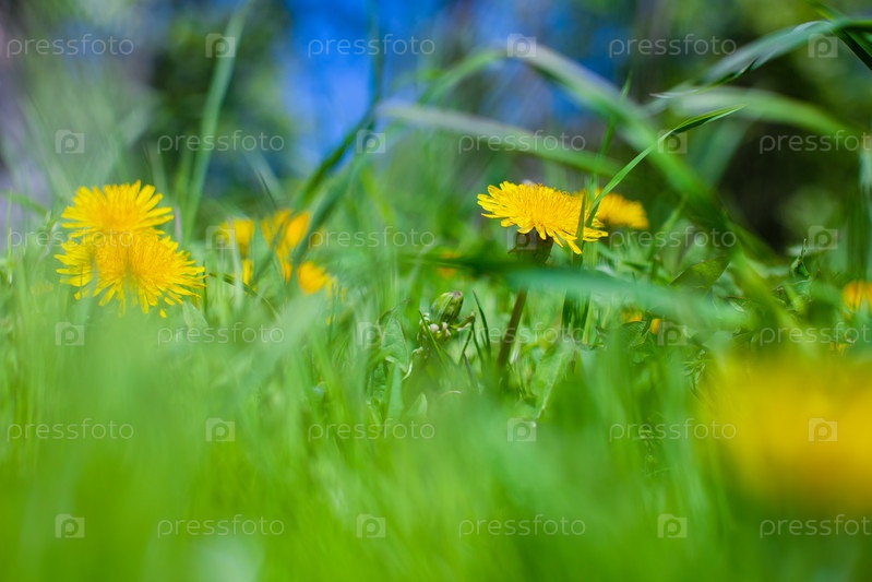 Желтый цветок осота на зеленом травяном лугу, желтый одуванчик на зеленом фоне, идеально подходит для фона, текстуры