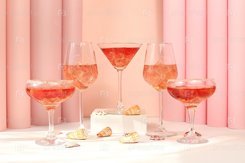 Современный летний натюрморт с розовым мартини, алкогольный коктейль Aperol spritz, шампанское и раковины на элегантном современном фоне, минимальная концепция бара и праздничной вечеринки, кафе, рекламный баннер