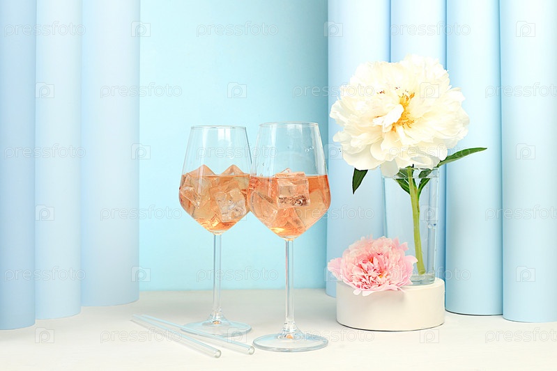 Современный летний натюрморт с алкогольным коктейлем Aperol spritz, шампанским и цветками пиона на элегантном современном фоне, минимальная концепция бара и праздничной вечеринки, кафе, рекламный баннер, выборочный фокус,
