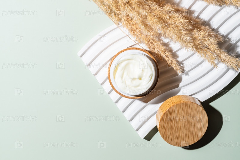 Крем для лица на зеленом фоне. Украшение из сухого камыша или пампасной травы. Профессиональный флакон для ухода за лицом и телом. Небрендовая упаковка