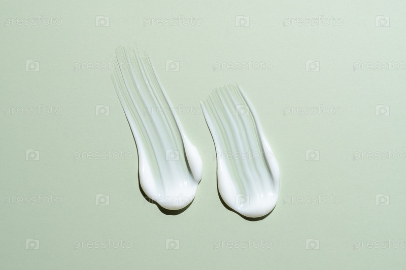 Текстура белого косметического крема, образец лосьона для ухода за кожей на нейтральном зеленом фоне. Крем для лица, увлажняющий крем для тела, кондиционер для волос, мазок, мазок. Сливочный косметический продукт крупным планом
