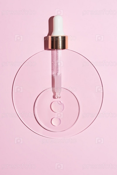 Пипетка крупным планом с гиалуроновой увлажняющей сывороткой на розовом фоне. Исследование концепции ухода за кожей красоты. Красота и спа