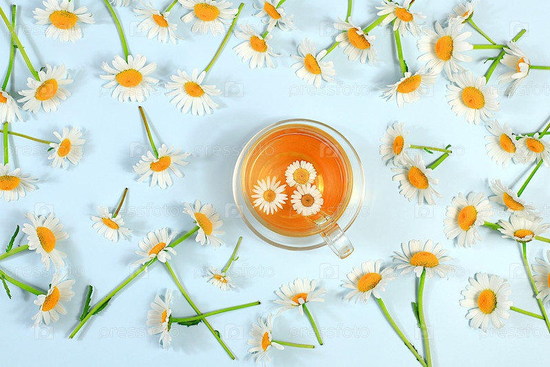Ромашковый чай со льдом в прозрачной чашке с натуральными маленькими цветками ромашки на светлом столе, концепция травяного чая и правильного натурального питания, летняя карта и отдых на свежем воздухе,
