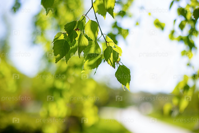 Ветка березы, зеленые свежие листья на ветке, фон размыт зеленым