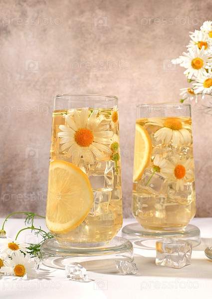 Ромашковый чай с лимоном в прозрачных стаканах с натуральными маленькими цветками ромашки на солнечном столе, концепция травяного чая и правильного натурального питания, летняя карта, избирательный фокус