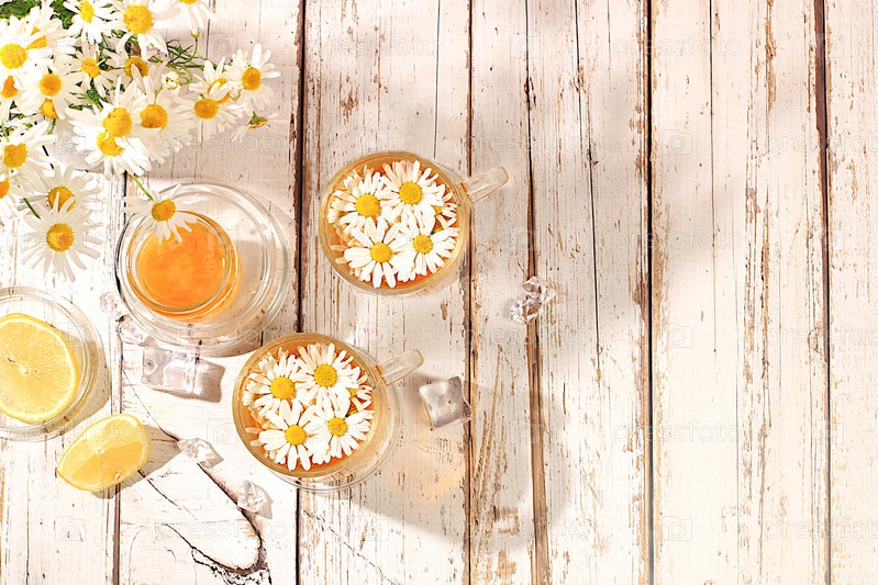 Ромашковый чай с лимоном в прозрачной чашке с натуральными маленькими цветками ромашки и цветочным медом на деревенском столе, концепция травяного чая и правильного натурального питания, летняя карта,