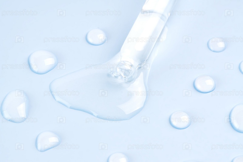 Пипетка для бутылок крупным планом и жидкая гиалуроновая сыворотка на синем фоне