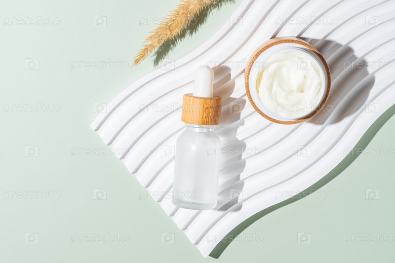 Стеклянная бутылочка с сывороткой, кремом или эфирным маслом. зеленый фон с каменным подносом и тенями от солнца. Натуральная косметика по уходу за кожей. Концепция красоты по уходу за лицом и телом
