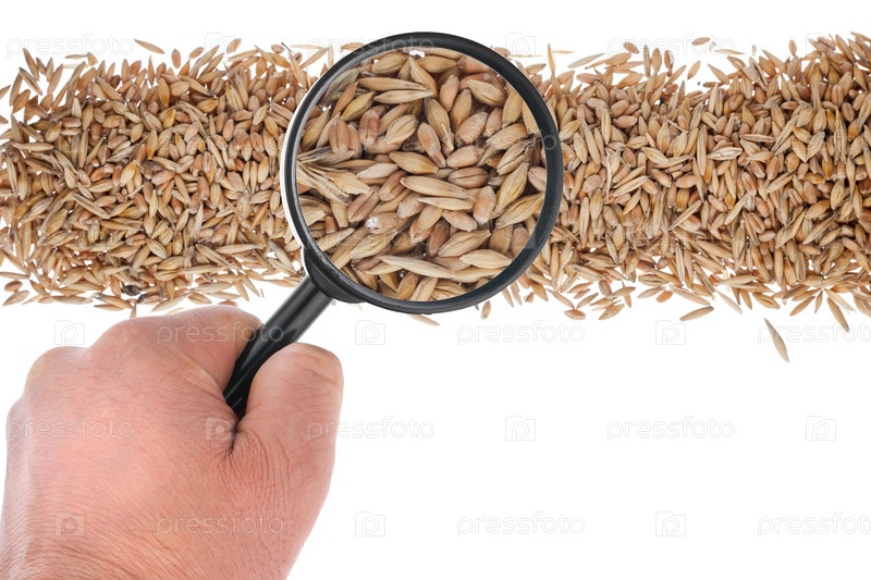 Рука держит увеличительное стекло над зерном