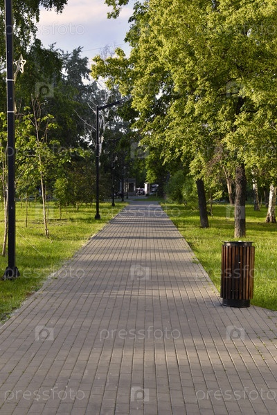 Вымощенная камнем дорожка в летнем парке. Деревья и трава в парке отдыха