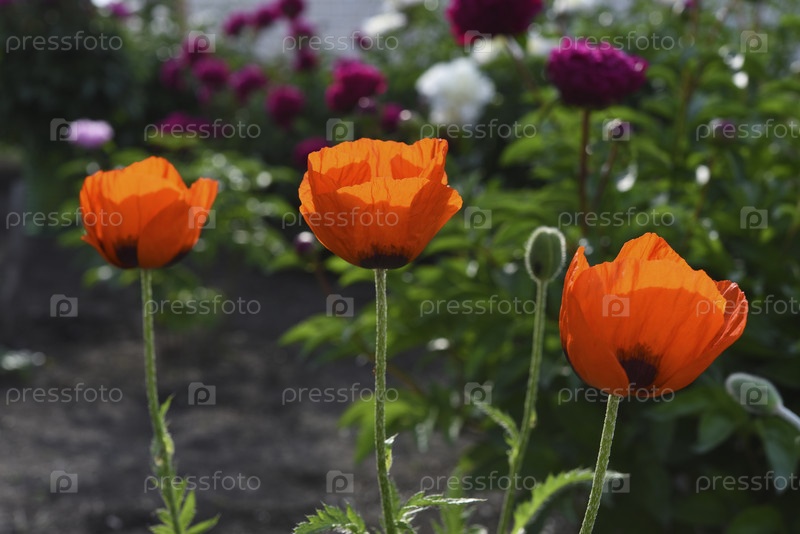 Красные цветы мака в летнем саду. Красный мак на зеленом фоне