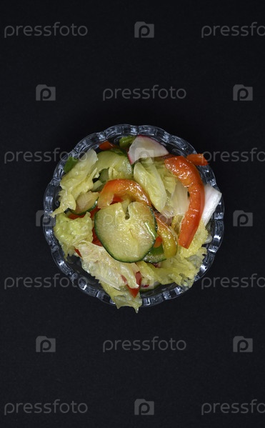 Овощной салат в стеклянной салатнице на черном фоне. Порция овощного салата