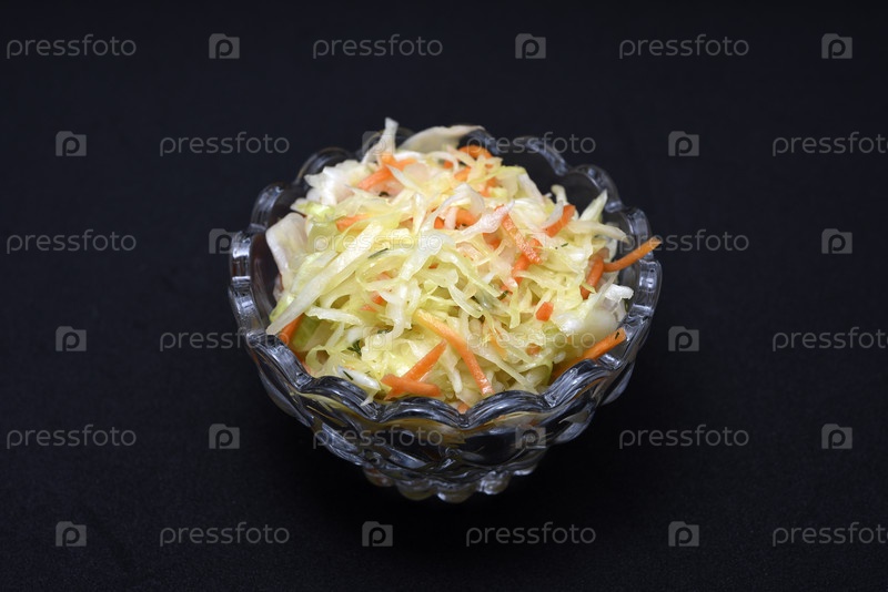 Овощной салат в стеклянной салатнице на черном фоне. Порция овощного салата