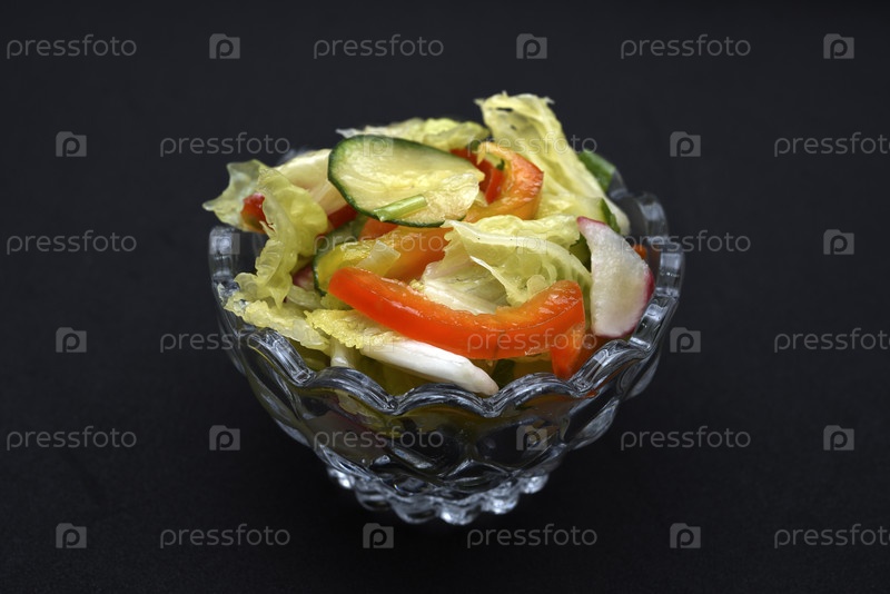 Овощной салат в стеклянной салатнице на черном фоне. Порция овощного салата