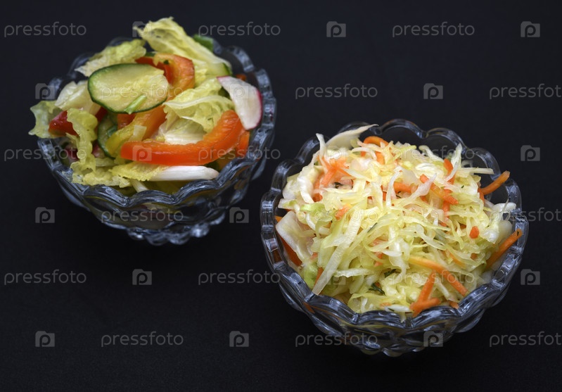 Овощной салат в стеклянной салатнице на черном фоне. Порция овощного салата