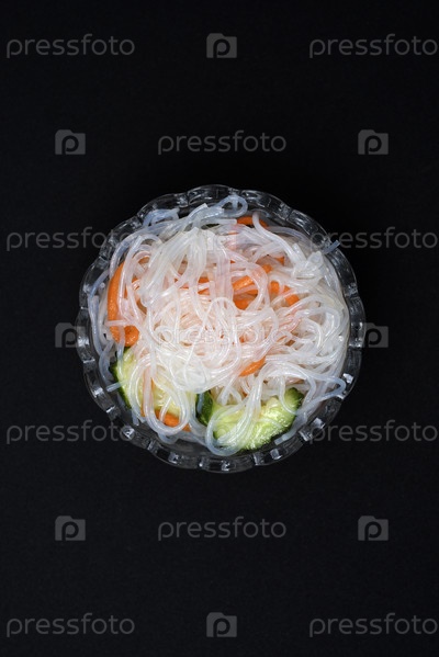 Овощной салат в стеклянной салатнице на черном фоне. Порция овощного салата и корейской лапши фунчезе