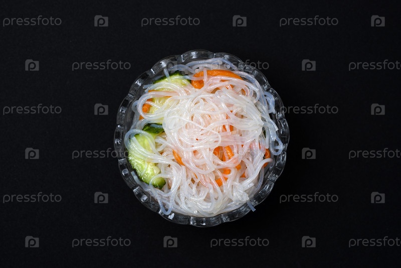 Овощной салат в стеклянной салатнице на черном фоне. Порция овощного салата и корейской лапши фунчезе