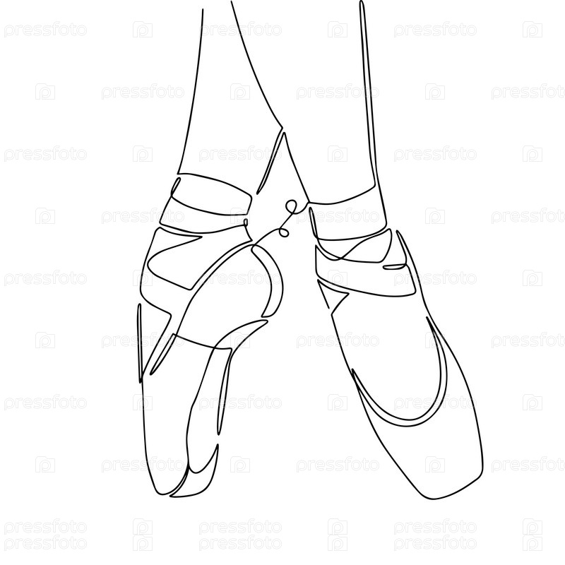 Ноги балерины в пуантах. Всемирный день балета. Одна линия рисунка для разных целей. Рисунок линии пуантов на белом фоне. Контурная векторная иллюстрация балета