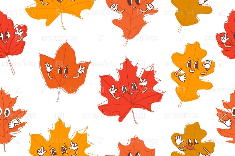 Бесшовный узор из осенних листьев в стиле каваи. Векторная иллюстрация на белом фоне