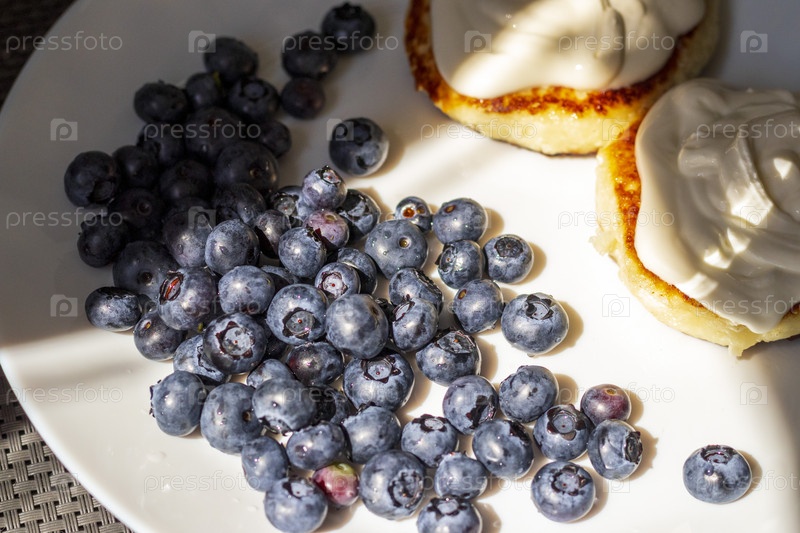 Снимок тарелки для завтрака с домашними чизкейками со сметаной и черникой. Еда