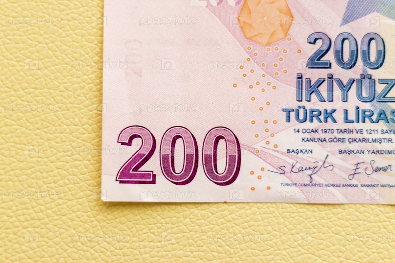 Крупный план купюры турецкой лиры на белом кожаном фоне. Финансы