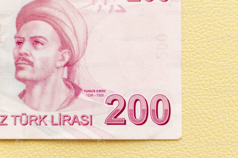 Крупный план купюры турецкой лиры на белом кожаном фоне. Финансы
