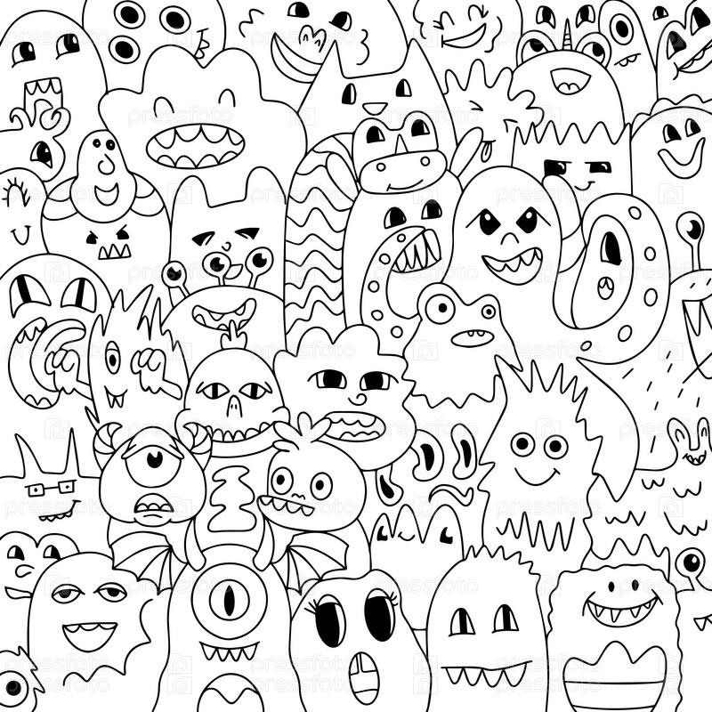 Забавный большой плакат с милыми монстрами в стиле каракулей. Забавные, нарисованные от руки инопланетяне. Дизайн для детей, комиксов, образования. Векторная иллюстрация