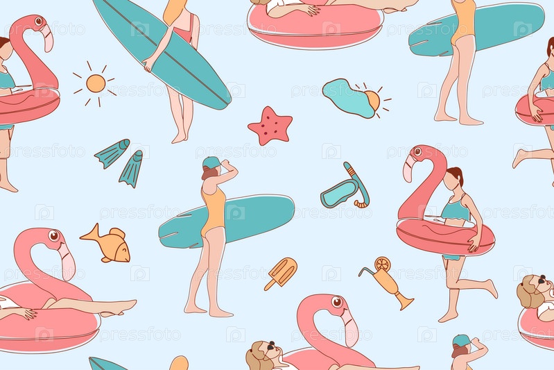 Бесшовный летний узор. Девушки с досками для серфинга и надувным кольцом в форме розового фламинго. Летняя вечеринка. Векторная иллюстрация