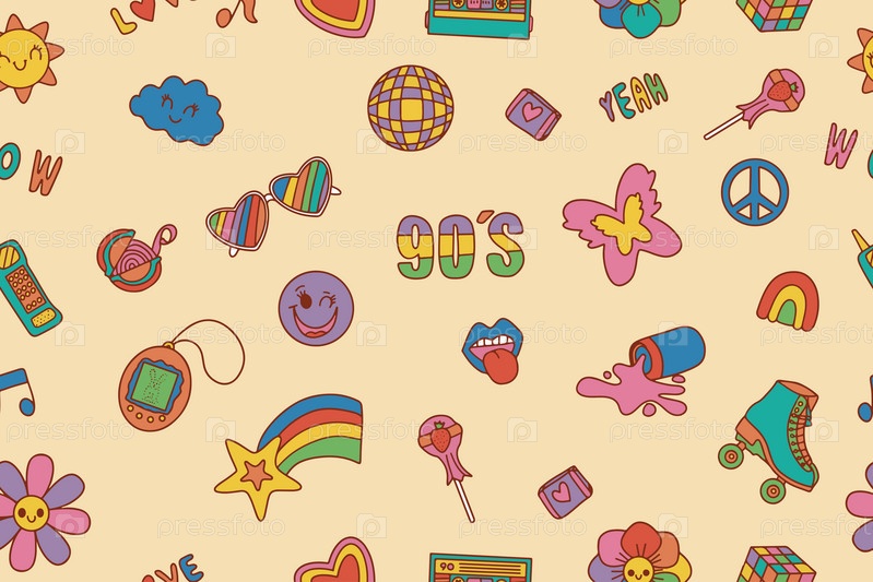 Бесшовный узор. Классические элементы 80-90-х годов в современной интерпретации. Ручная рисованная векторная иллюстрация. Модная нашивка, значок, эмблема
