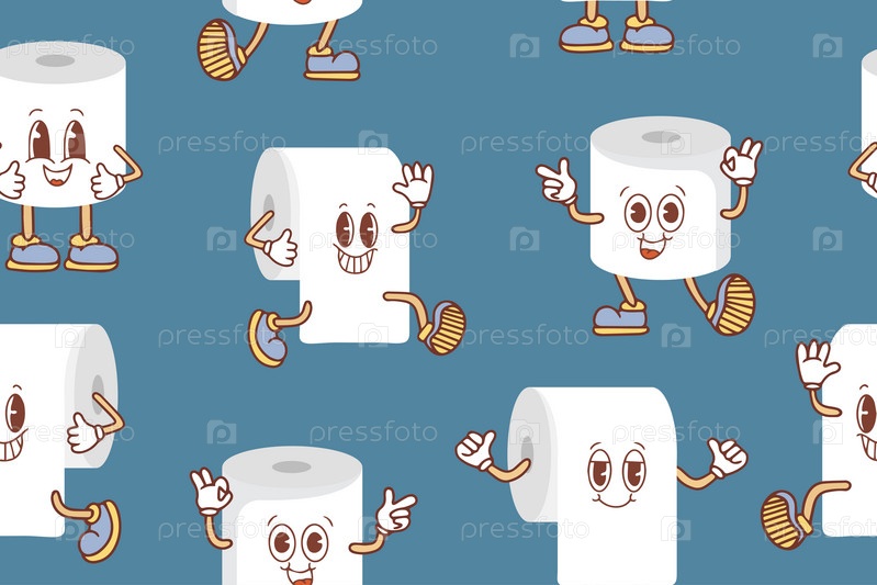 Бесшовный узор с милыми мультяшными рулонами туалетной бумаги с лицами в стиле Каваи. Векторная иллюстрация