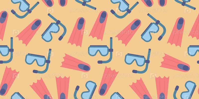 Бесшовный рисунок плавательной маски и плавников в плоском стиле, изолированный на желтом фоне. Аксессуары для дайвинга. Векторная иллюстрация