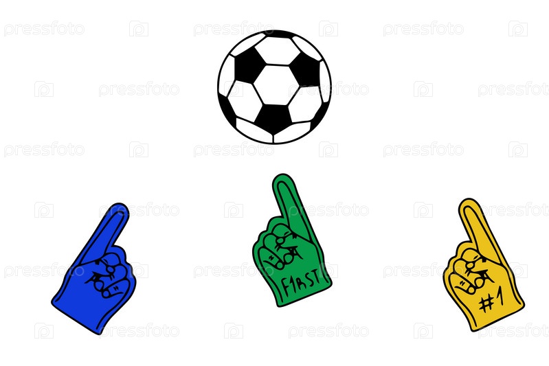 Футбольный болельщик, пенопластовые пальцы и мяч, векторное изображение. Спортивная концепция Вентиляторные пенопластовые руки. Атрибут пальца спортивного фаната, поддержка футбольной команды, аксессуары