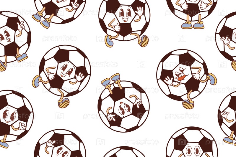 Бесшовный рисунок милых забавных счастливых персонажей футбольного мяча. Ручная рисованная векторная иллюстрация персонажа мультфильма Каваи. Векторная иллюстрация